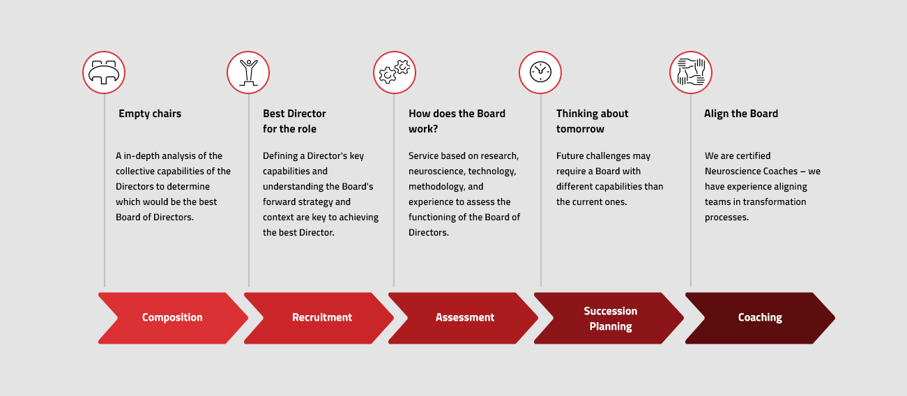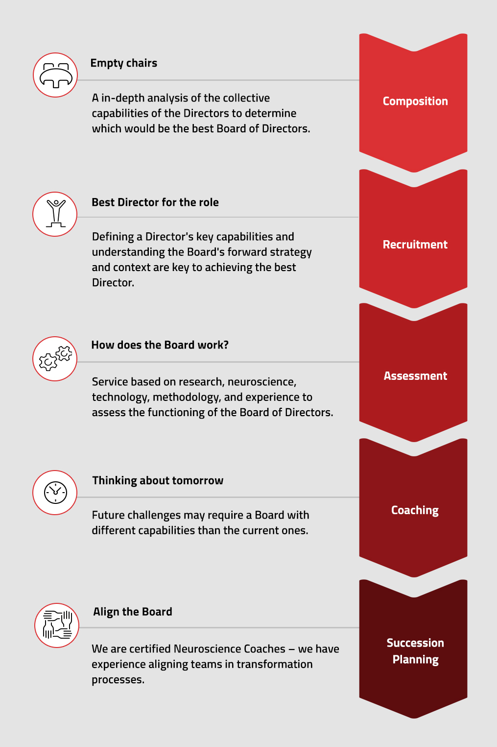 • Board Functioning Assessment: Personalized interviews with Board members, majority shareholders (if any), the company’s CEO, and their direct reports to understand how the company works. This ensures that key topics are discussed and that the experiences of all the valuable people who comprise it are incorporated. We have online assessment tools to measure self-perception versus how one is perceived by others. Based on all the material collected, we identify how the Board functions, its strengths, and opportunities for individual and collective improvement. We hold individual and collective meetings to share the findings and define a future strategy with the Board.