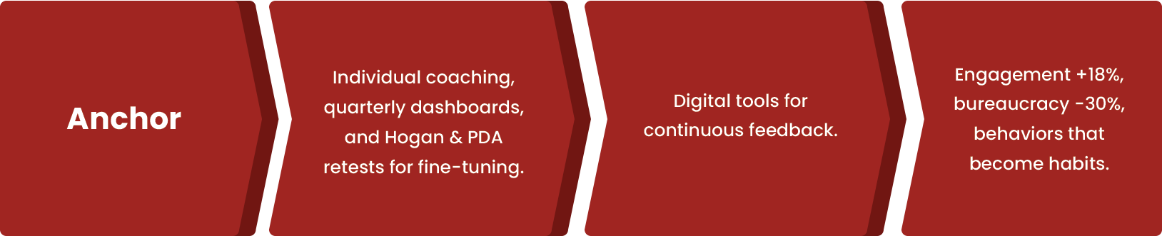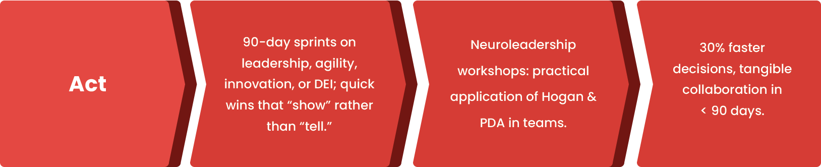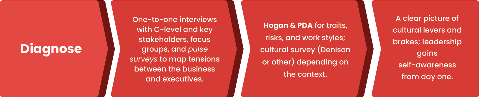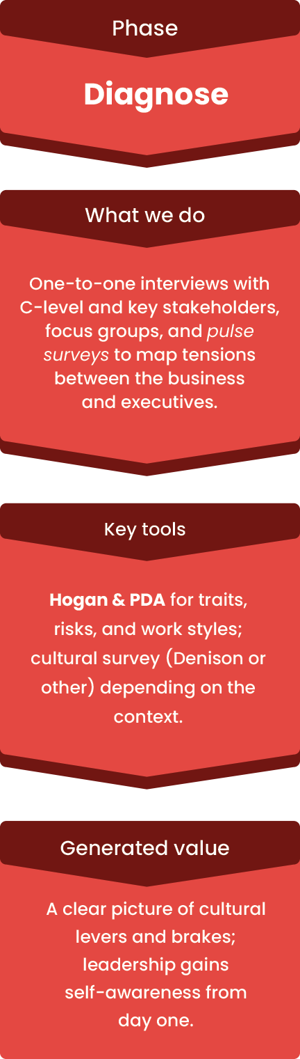 Our exclusive framework for Culture & Transformation combines deep listening, Hogan, PDA and Denison assessments, leadership co‑creation and habit coaching.