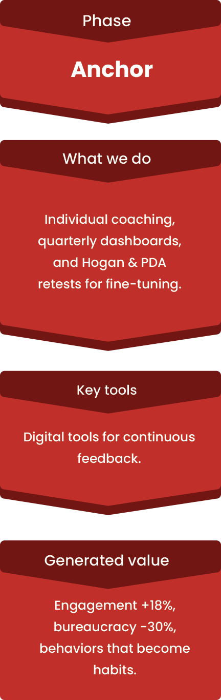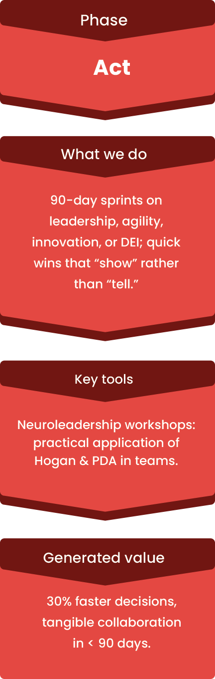 Our exclusive framework for Culture & Transformation combines deep listening, Hogan, PDA and Denison assessments, leadership co‑creation and habit coaching. It also integrates neuro‑leadership practices, culture surveys (Denison or others) and agile metrics to generate visible and sustainable change.