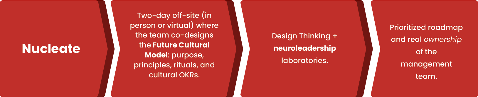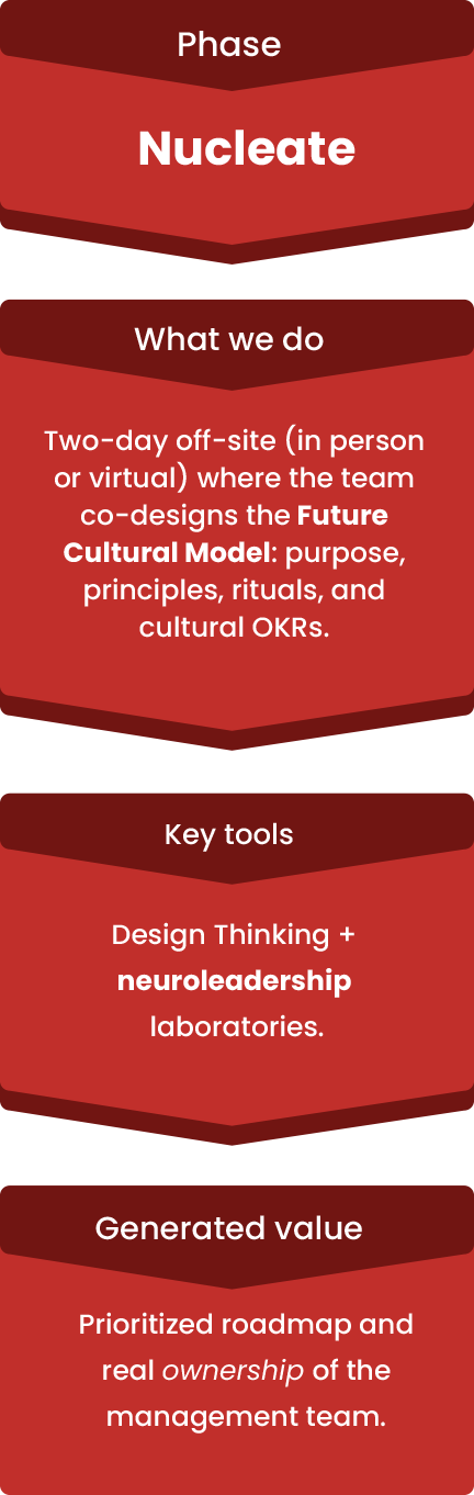 • Co‑creation that drives commitment. The cultural model emerges from the team itself, triggering real commitment.